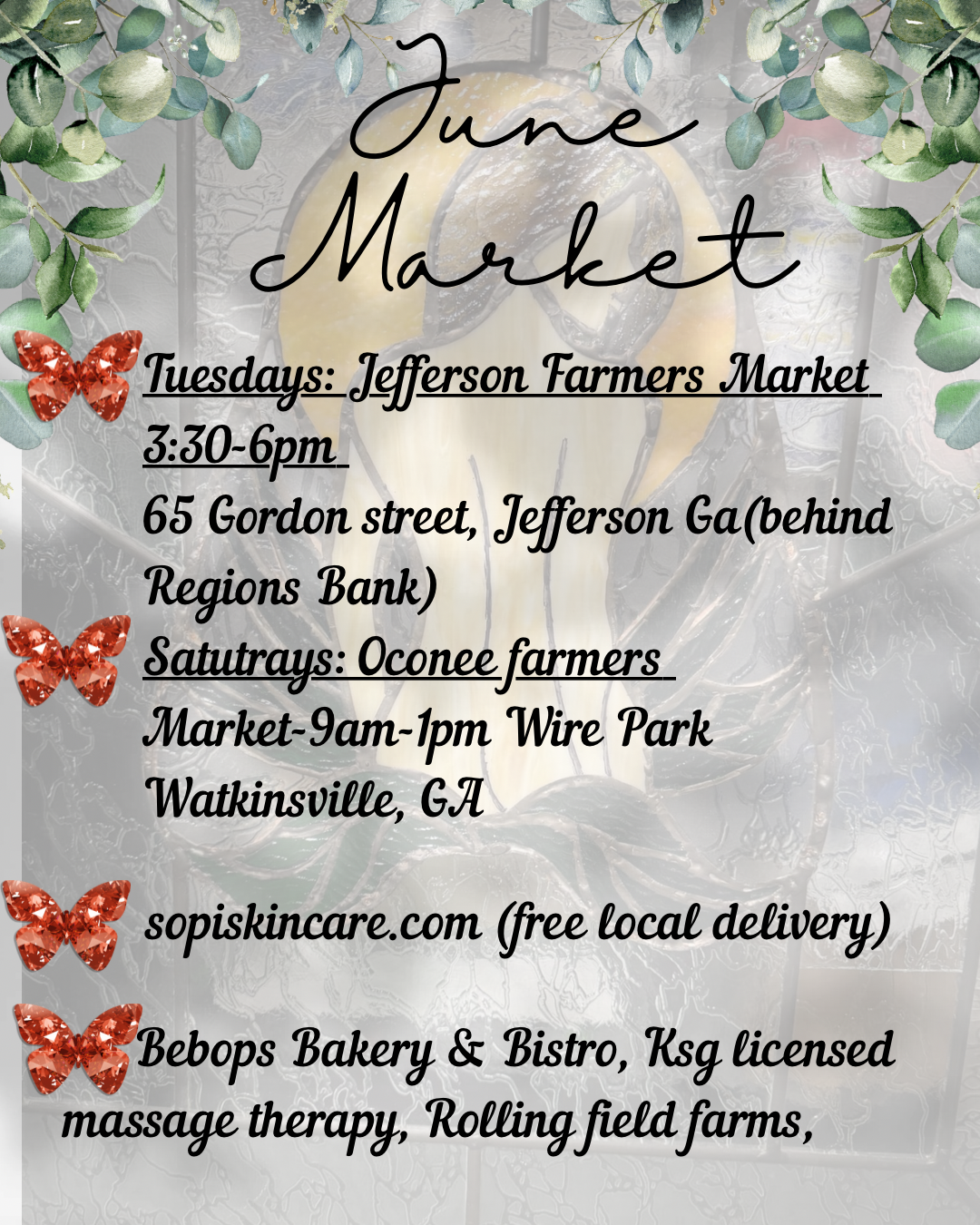 ✨ Our June Market Schedule is here! ✨Come visit us and shop your favorite handcrafted skincare at one of our local markets 💛 ! 📍 Tuesdays – Jefferson Farmers Market⏰ 3:30–6pm | 65 Gordon St, Jefferson GA (behind Regions Bank) 📍 Saturdays – Oconee Farmers Market⏰ 9am–1pm | Wire Park, Watkinsville GA. You can also find us at:🧴 sopiskincare.com (free local delivery) 🍰 BeBop’s Bakery & Bistro (Royston) 🌾 Rolling Fields Farm (Commerce) 💆 KSG Massage Therapy (Danielsville) 💅 D’Cache Salon & Spa (Gwinnett). Every product is made with love, hand-rendered tallow, and ingredients from our very own homestead 🌿