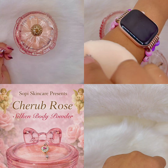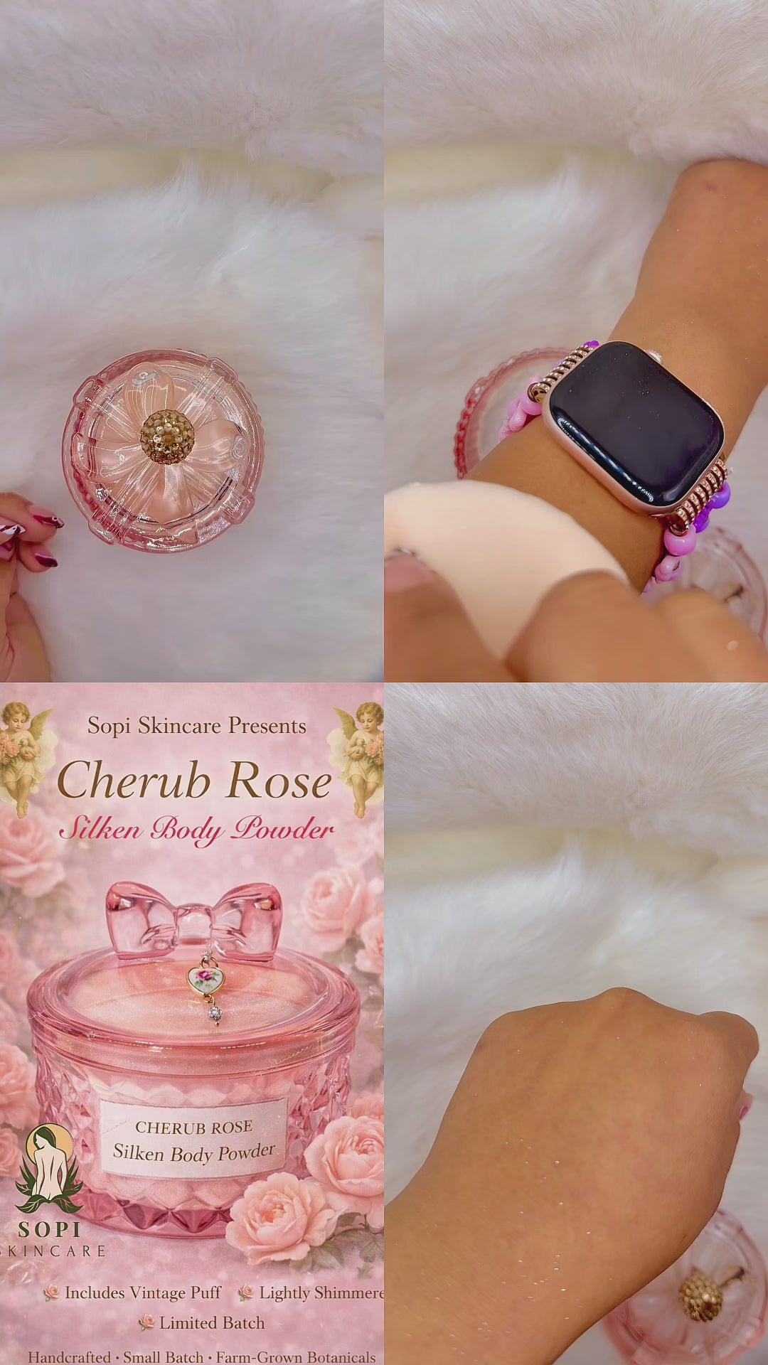 This ultra-fine silken body powder leaves skin feeling velvety smooth with a soft, luminous shimmer. Lightly scented with our signature Cherub Rose fragrance, it’s perfect for daily ritual, special moments, or layering with the matching perfume and body serum.